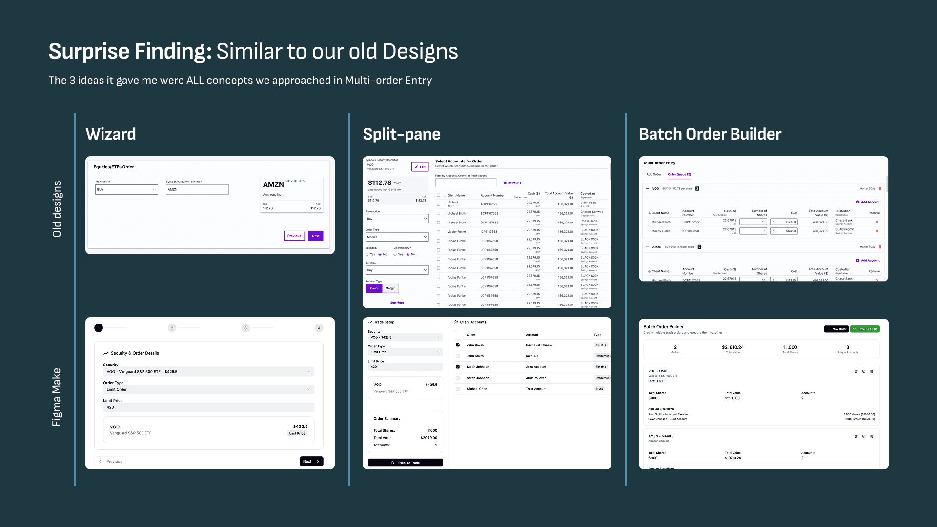 Explored how Figma Make could create alternative proof-of-concepts directly from prompts, then refined outputs through iterative instructions, using Multi-Order Entry as the test case.