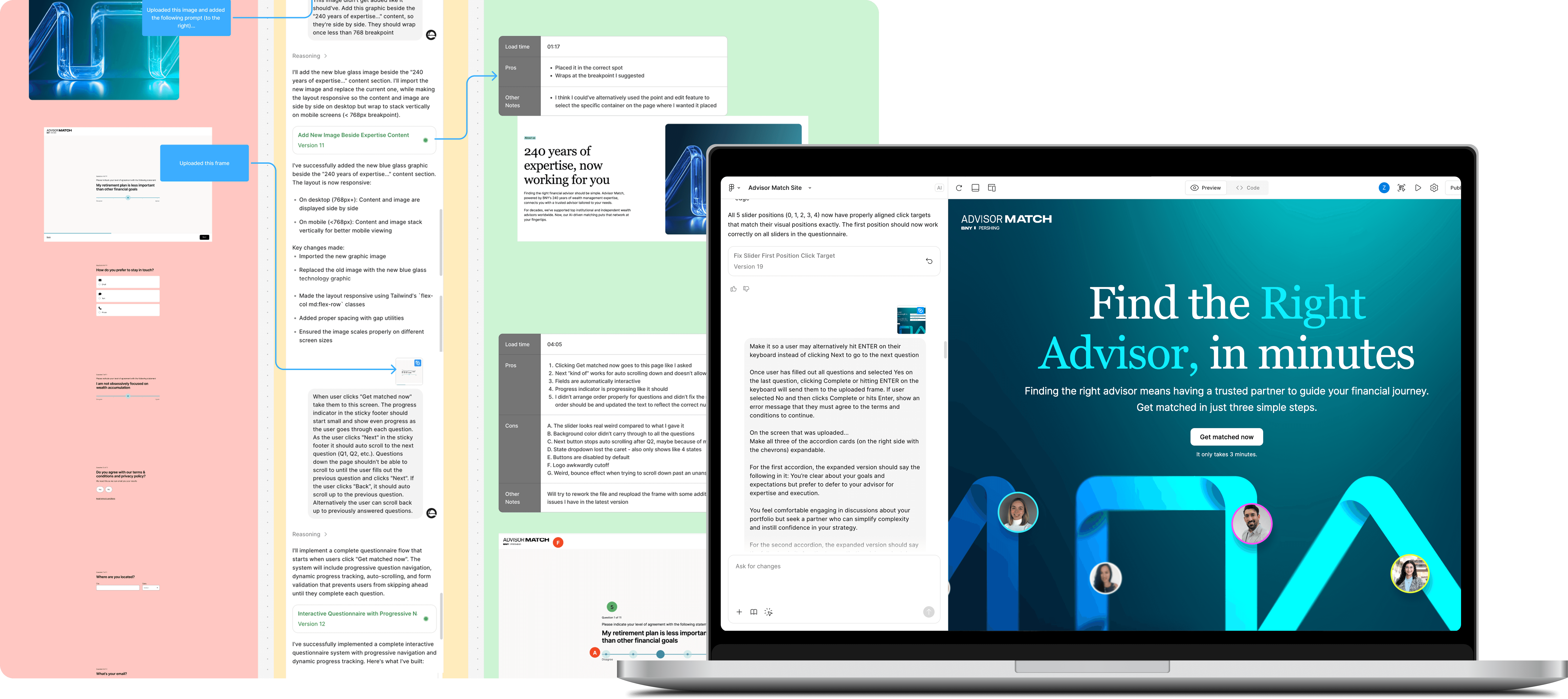 Used Figma Make to generate a fully interactive prototype from existing designs, leveraging an Advisor Match flow as the reference.
