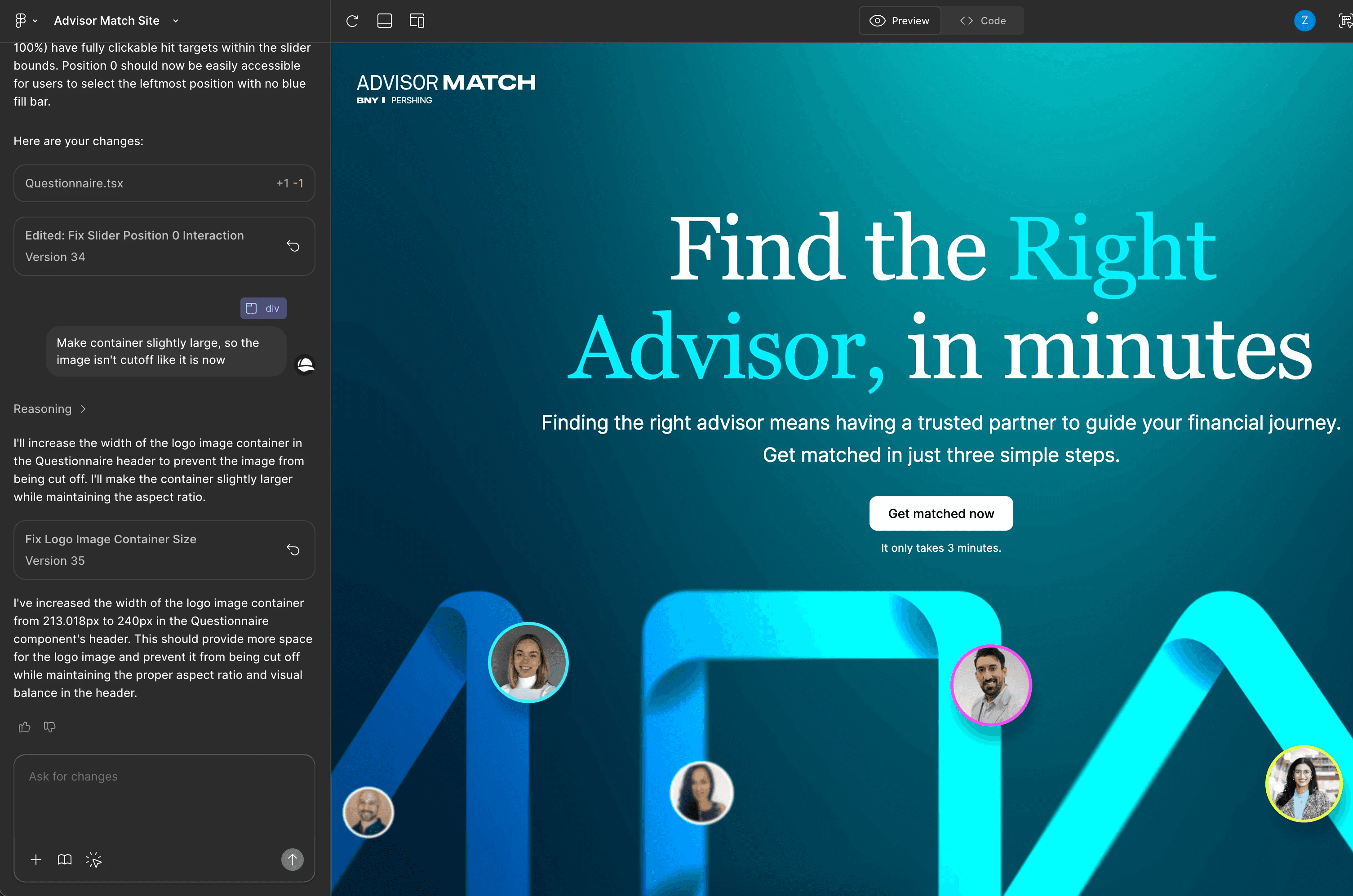 Leveraged Figma Make to generate a fully interactive prototype from existing designs, using Advisor Match as the reference.